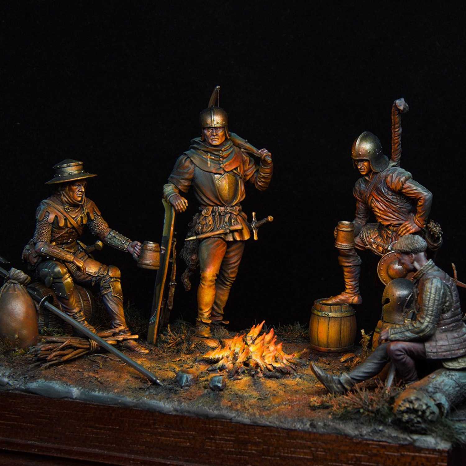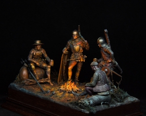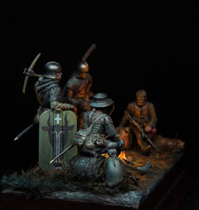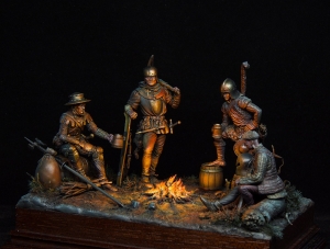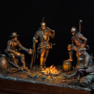 We have assembled 75mm Tartar Miniatures figures and created a diorama of museum quality. Diorama is implemented with object source lighting (OSL) effect. Swiss mercenaries are refecting themselves after the yet another bloody battle and commemorating the fallen before enemies for the sake of glory. 15th century, Burgundian Wars. The diorama is available for order in our shop. |
