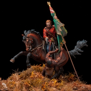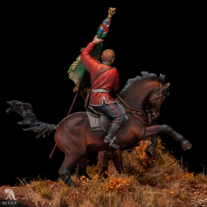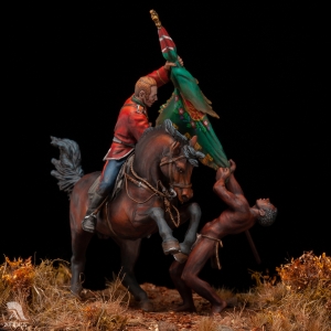 Scale: 1/32 (54mm). Browse the vignette in the shop: New custom-made vignette created by Attica Miniatures: Saving the Queen's Colours (painting by Alphonse de Neuville). At the battle of Isandlwana on 22nd January 1879, a Zulu army of about 20,000 warriors inflicted a massive defeat on a much smaller British force, mainly comprised of men from the 24th Regiment of Foot. Toward the end of the battle, two British lieutenants, Nevill Coghill and Teignmouth Melvill, were killed attempting to defend the Queen’s Colour of the 1st Battalion. They were caught by the Zulus as they attempted to carry the Colour across the Buffalo River. Despite their brave efforts they were eventually overwhelmed. The capture or loss of the Colour in battle indicated the dispersal of the regiment and had at all costs to be avoided. This led to many dangerous situations, and many soldiers died in defence of their Colour. Melvill and Coghill were the last British soldiers to give their lives for a British Colour. As a result of their deaths, Queen Victoria forbade the carrying of the Colour into battle. When the Colour was found and returned to England, Queen Victoria crowned it with a wreath of dried flowers (known as a “Wreath of Immortelles”). She later granted that a silver wreath was to be permanently attached to the pike of the Queen’s Colour. The miniatures of Lieutenant Melvill and Zulu warrior created from scratch and produced by Attica Miniatures are available for sale painted on order.