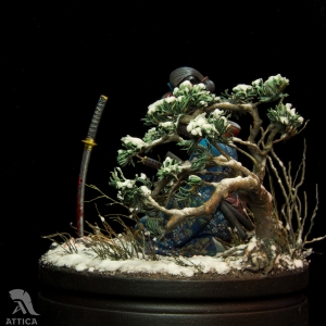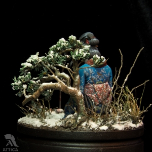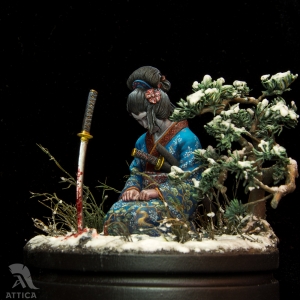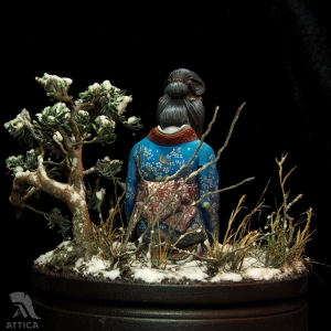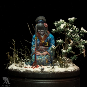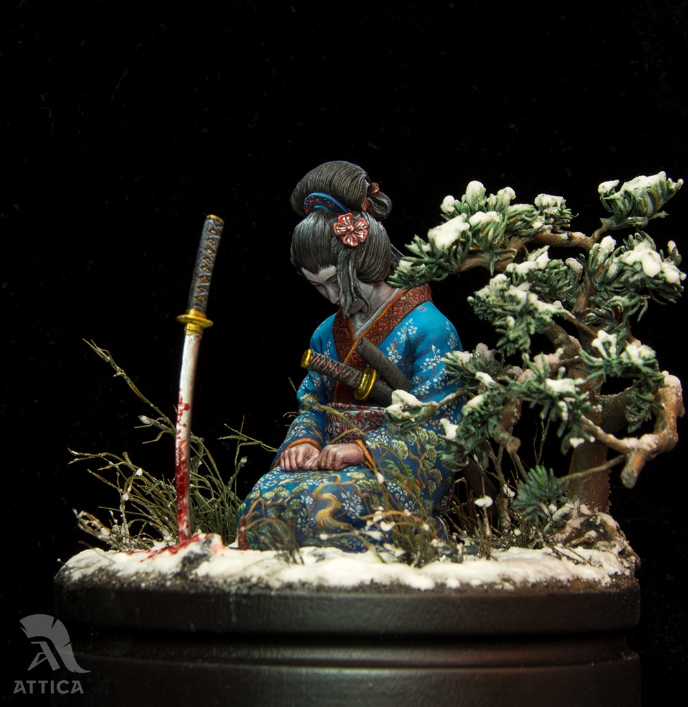 Her husband's body was barely cold when she decided to avenge his death. On that day, she put on her best black satin kosode kimono richly embroidered with miniature floral patterns. Carrying the husband's swords stuck in her wide obi belt, she fearlessly came to the enemy's house. The cold steel was longing for a revenge. The big and heavy katana filled her movements with power and did its work. She was kneeling by the ashes of the ended war flying before her eyes, while the sakura tree was dropping the petals behind, like tears.