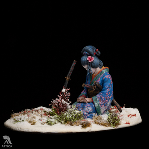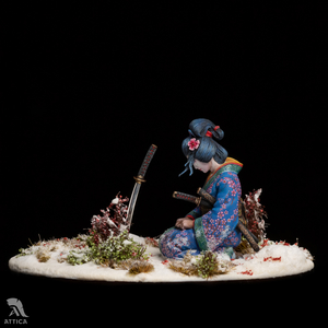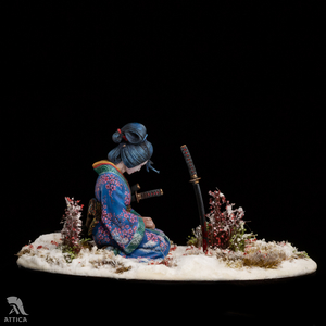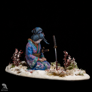 Her husband's body was barely cold when she decided to avenge his death. On that day, she put on her best black satin kosode kimono richly embroidered with miniature floral patterns. Carrying the husband's swords stuck in her wide obi belt, she fearlessly came to the enemy's house. The cold steel was longing for a revenge. The big and heavy katana filled her movements with power and did its work. She was kneeling by the ashes of the ended war flying before her eyes, while the sakura tree was dropping the petals behind, like tears.